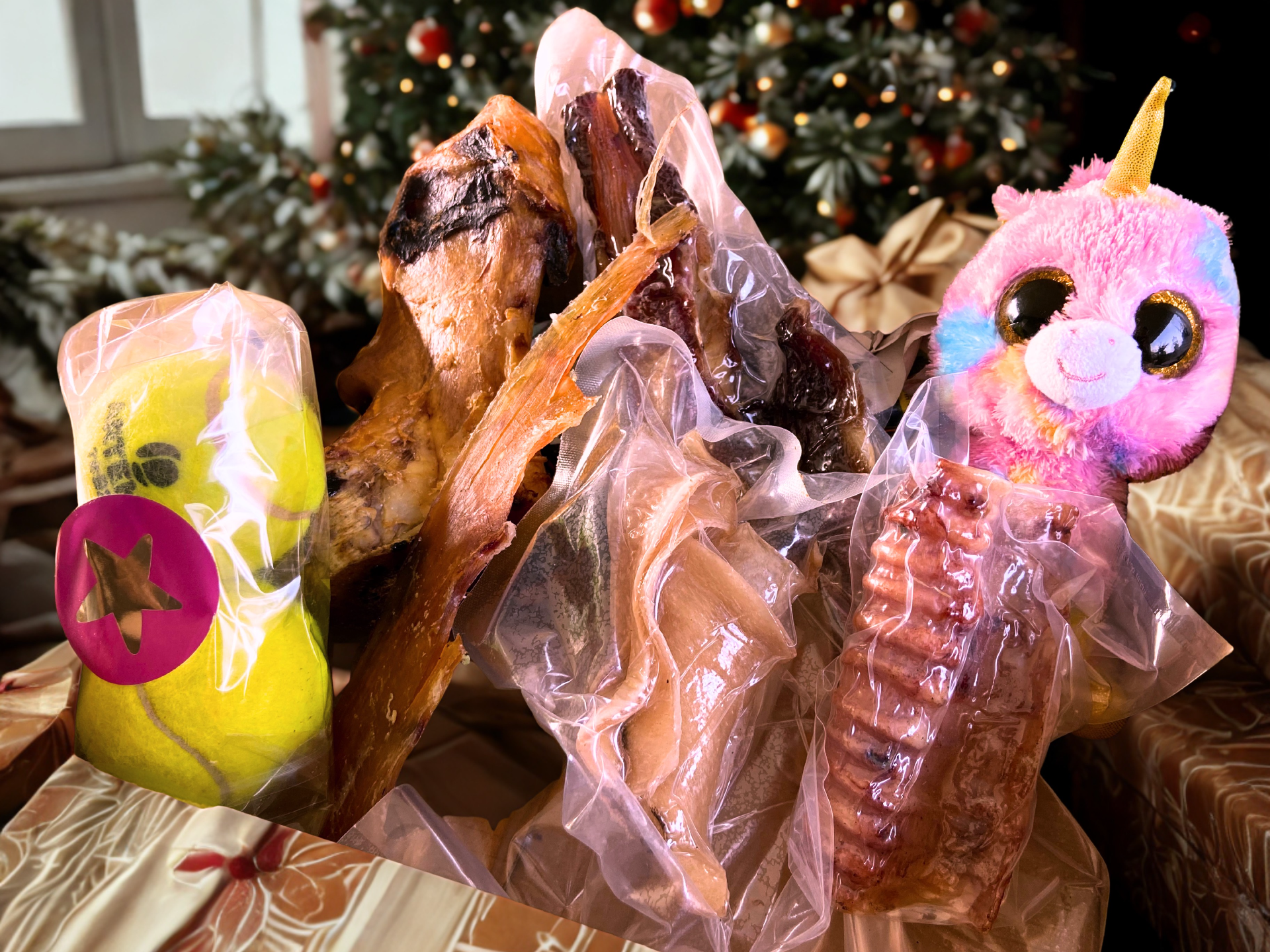 Deze gift box is gevuld met 100% natuurlijke hondensnacks, twee ballen en een pluche vriendje.